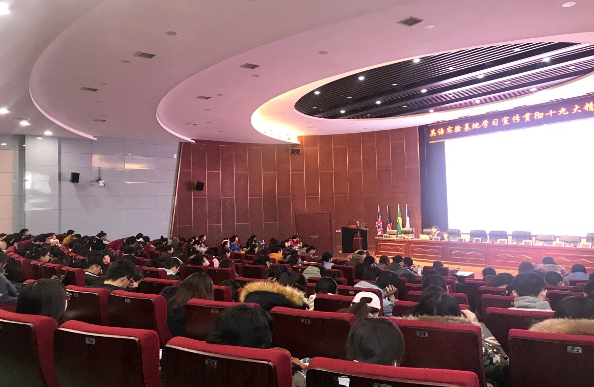 当晚,英语实验基地全体学生在各自固定教室开展“学习十九大 青春我先行”的主题班会,参会同学积极分享自身感悟,有效加深广大青年学子对党的十九大的认识。
