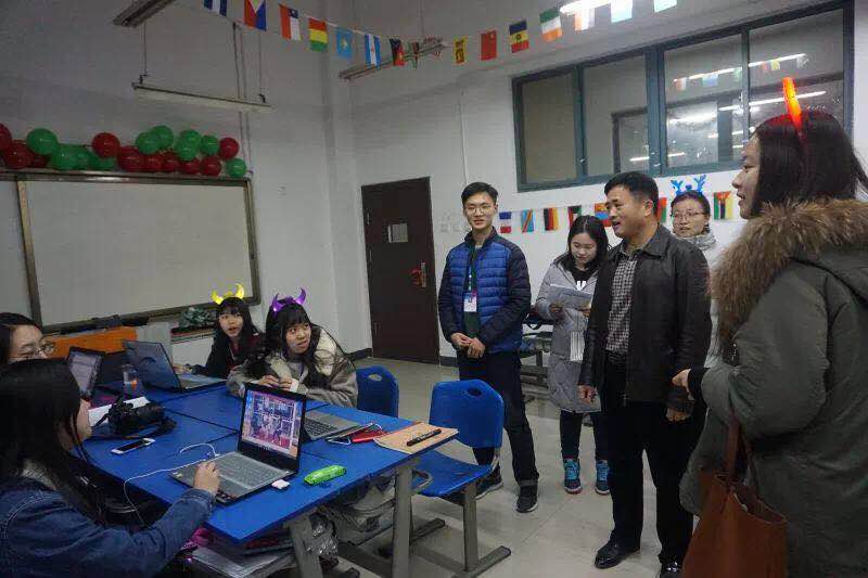 活动一开始,英语实验基地党总书记蓟光辉老师,辅导员张淑茜老师、马捷老师、梁静老师惊喜现身,蓟老师肯定了本次班级文化节的成果的同时许下了2018的美好祝愿,老师们与我们一起欢乐,将现场的活动氛围推向了高潮。