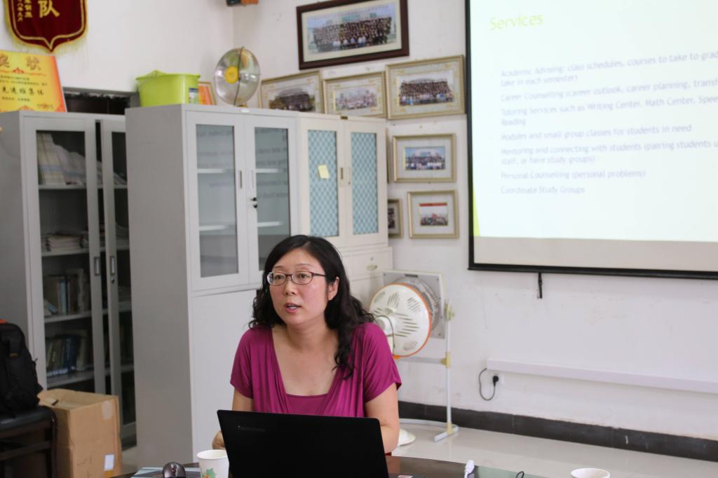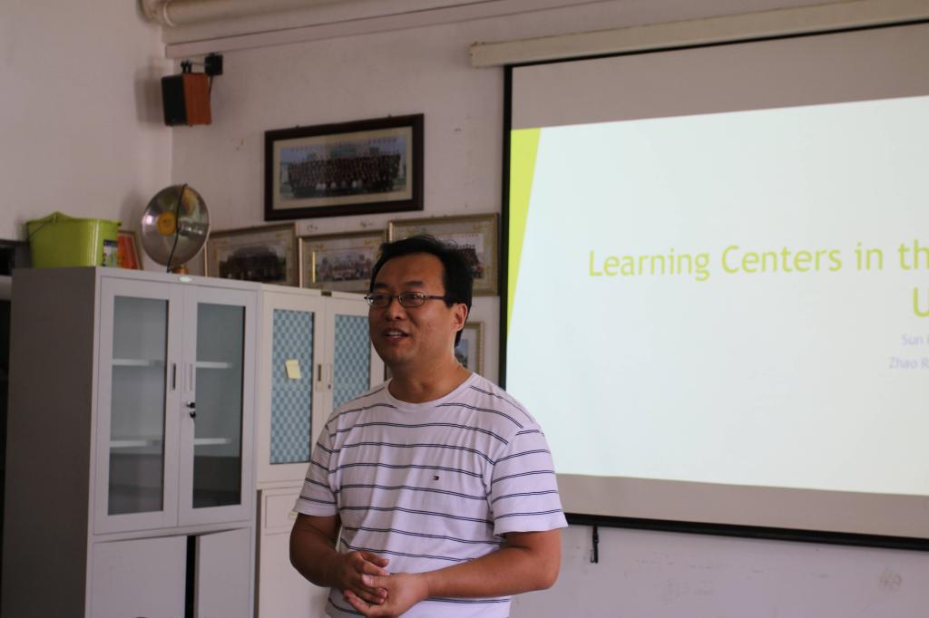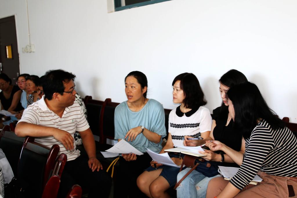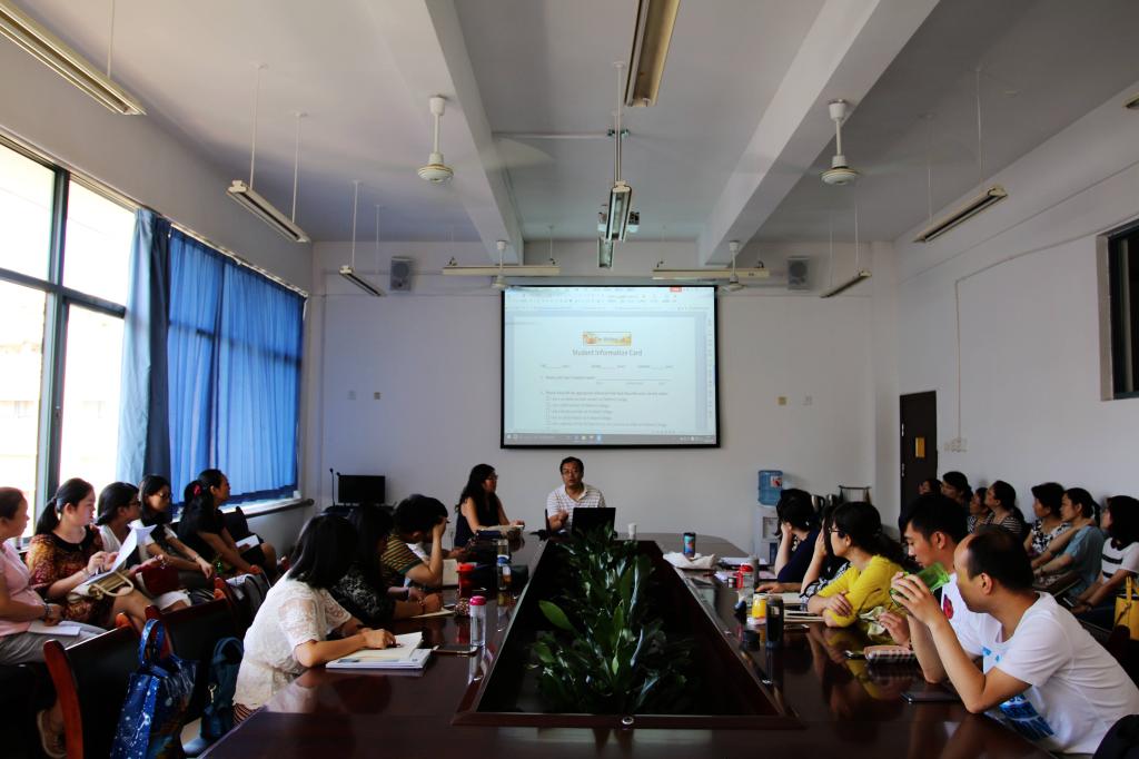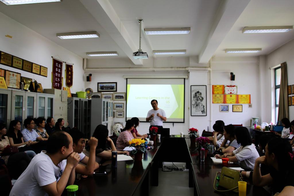 为更好地服务广大学生,做好学生学习策略训练,拓展性学习指导,帮助学生发觉自身潜力与优势,制定个人学业规划,更好地成长成才,英语实验基地于6月14日至16日举办了学业指导中心教师系列培训暨第四期教学论坛,积极为成立英语实验基地学业指导中心做准备。此次培训,邀请了美国伊利诺伊州格林维尔大学孙康博士和香槟市帕克兰学院赵蕊洁博士前来指导交流。英语实验基地全体教师参加了培训。