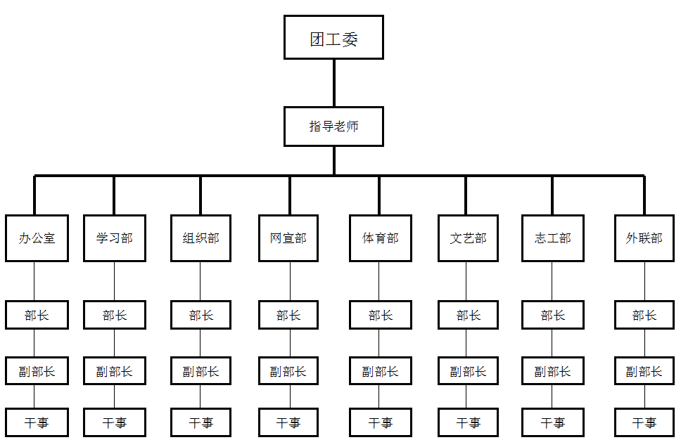 英语实验基地团工委是在指导老师引导下,学生自我管理,自我服务,自我学习的学生组织,是基地联系学生的桥梁和纽带。英语实验基地团工委以指导老师4人为领导核心,下设办公室,学习部,组织部,网宣部,体育部,文艺部,志工部和外联部8大部门。其组织结构如下: